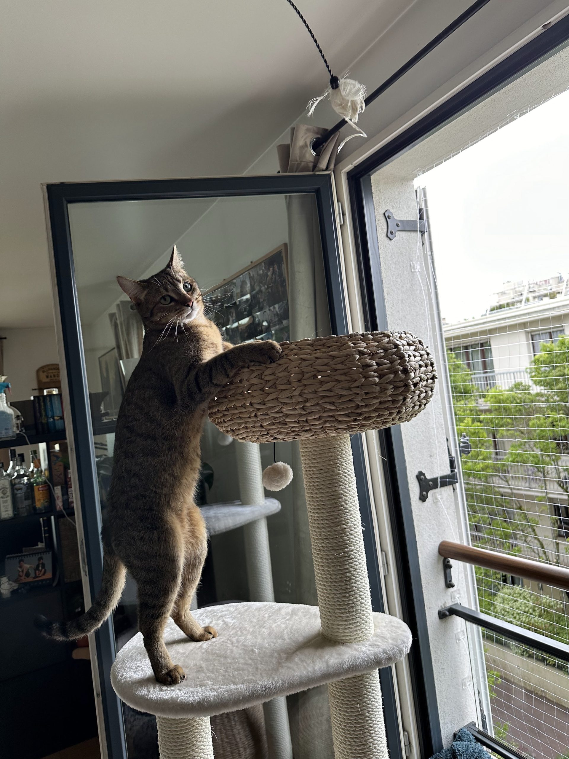 Placement idéal : Dans un foyer sérieux, responsable ayant un grand espace de vie. Un peu de présence aussi. Un balcon très sécurisé sera bienvenu. Enfants à partir de 8/10 ans. Entente avec un autre congénère inconnue. Adoptée en janvier 2025