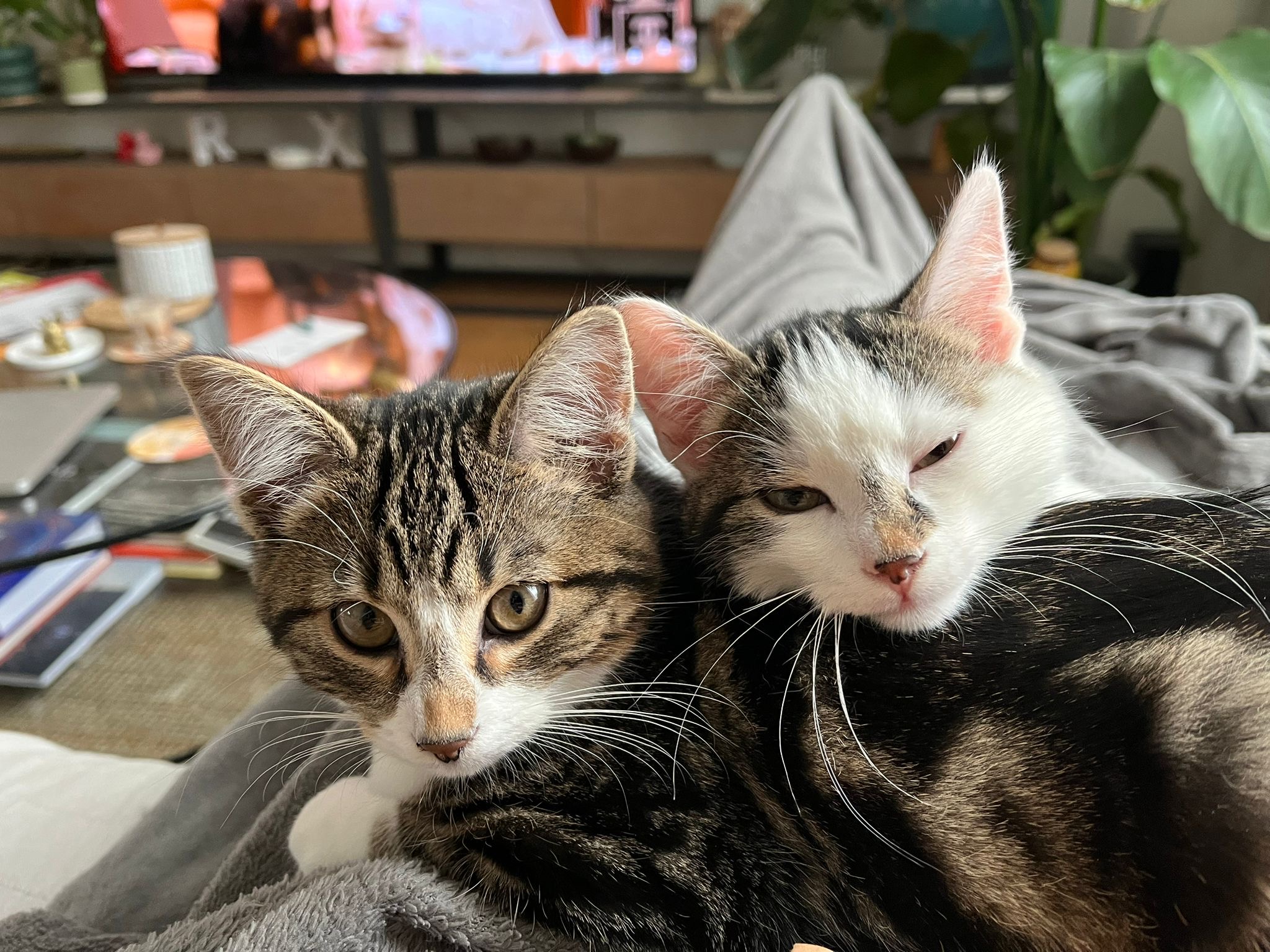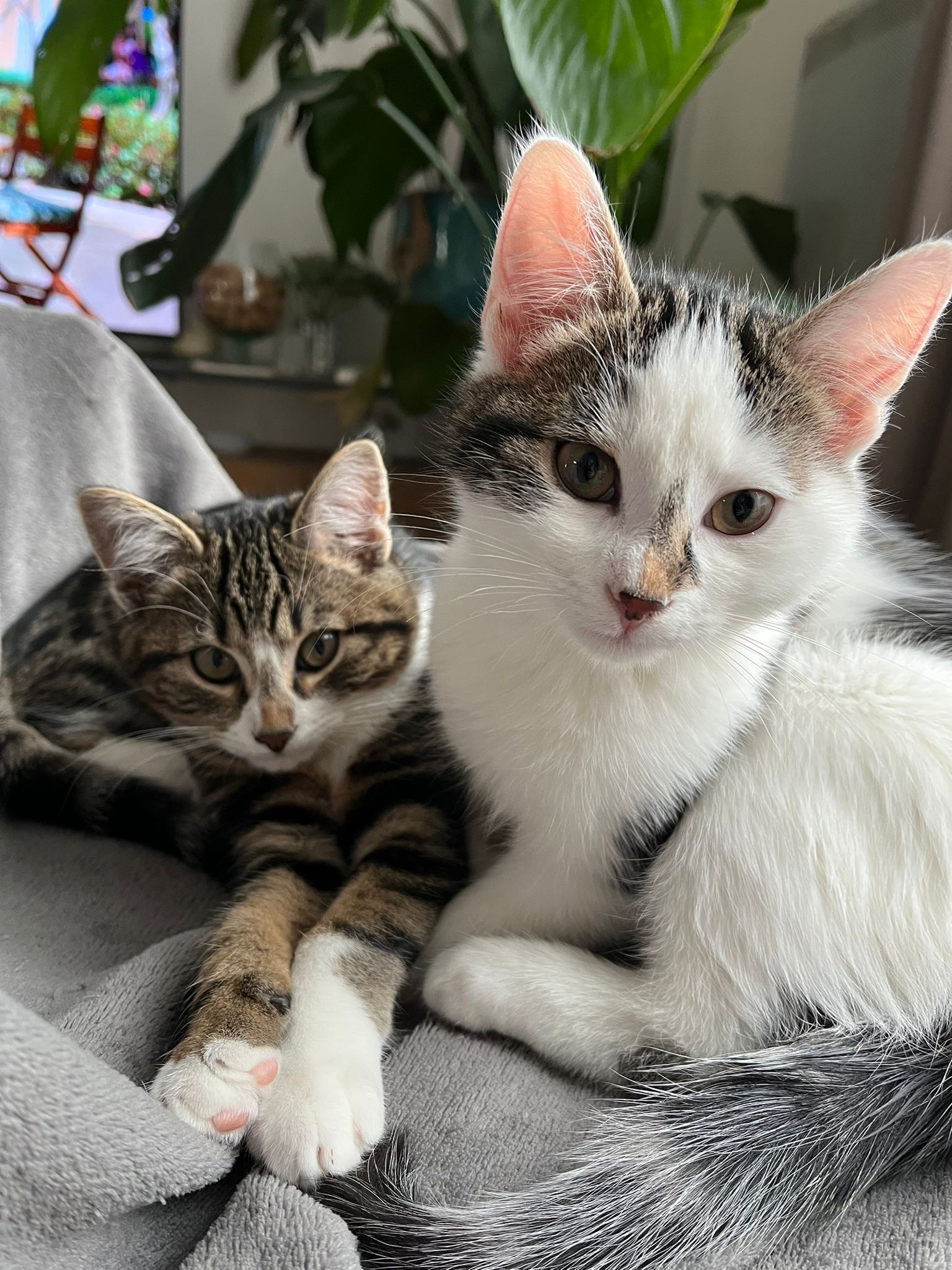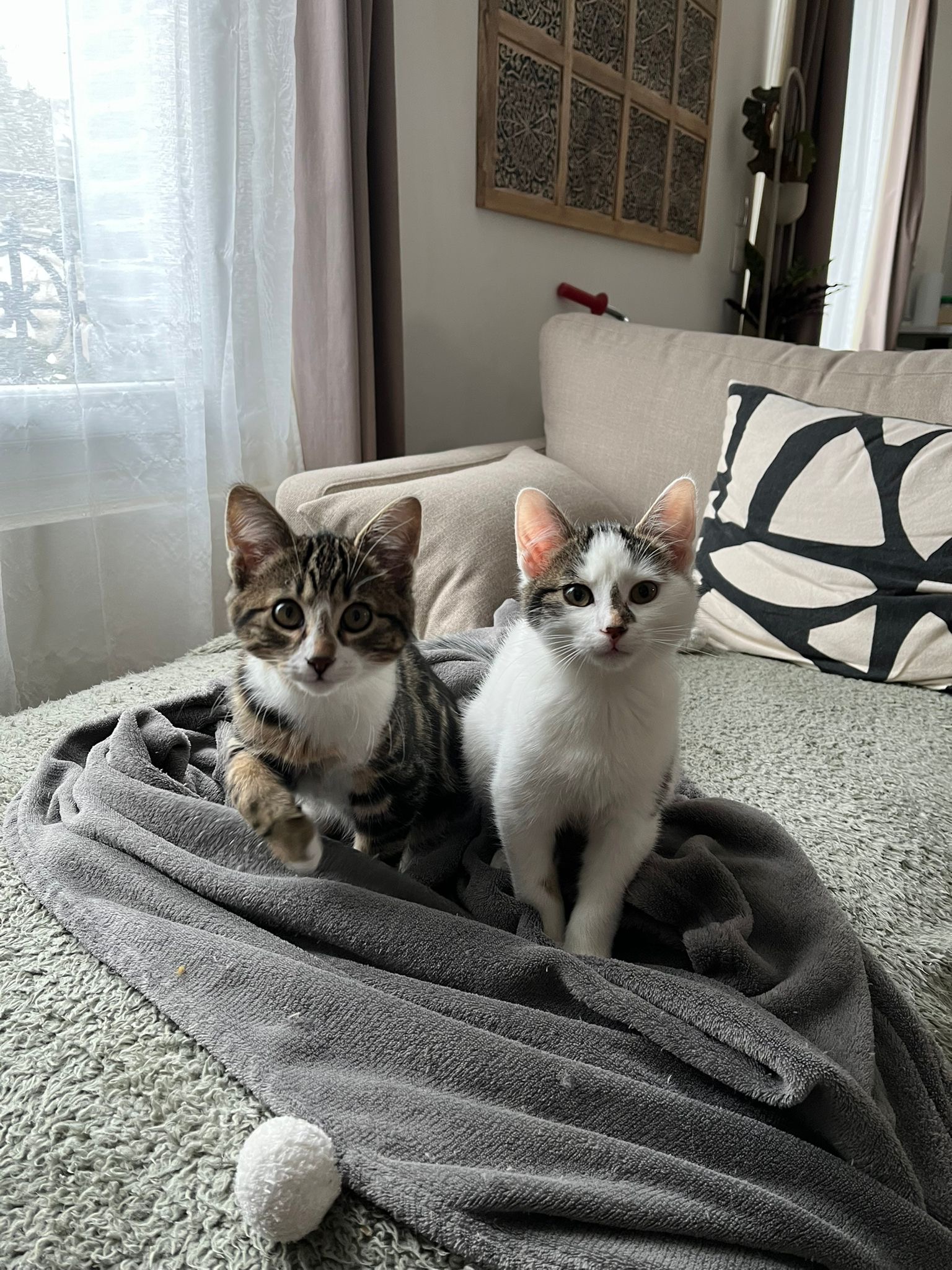 Caractère : Ces deux frères sont deux adorables petites boules de poils. Ces petits chatons sont très sociables et adorent le contact avec l’humain. Véritables machines à ronrons, Eddy & Mitchel adorent se blottir contre vous et se poser sur vos genoux. Ils sont aussi très joueurs, aussi bien en duo qu’en solo et sont très dynamiques. Petits gourmands, il ne faut toutefois pas laisser des restes de repas autrement ils se feront un plaisir de les terminer.  Mitchel est plus bavard que son frère et n’hésitera pas à vous réclamer de l’attention en miaulant tandis qu’Eddy viendra directement vous voir pour essayer de grimper dans vos bras. En bref, 2 petites boules d’amour, tres sociables et de véritables machines à ronrons !