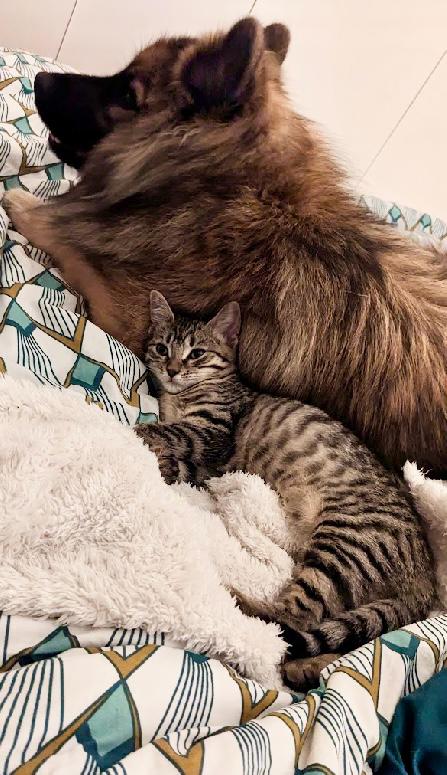 Placement idéal : dans une famille très présente, avec d’autres animaux et de l’espace. Pas de jeunes enfants à cause de ses mordillements. Adoptée en décembre 2025.