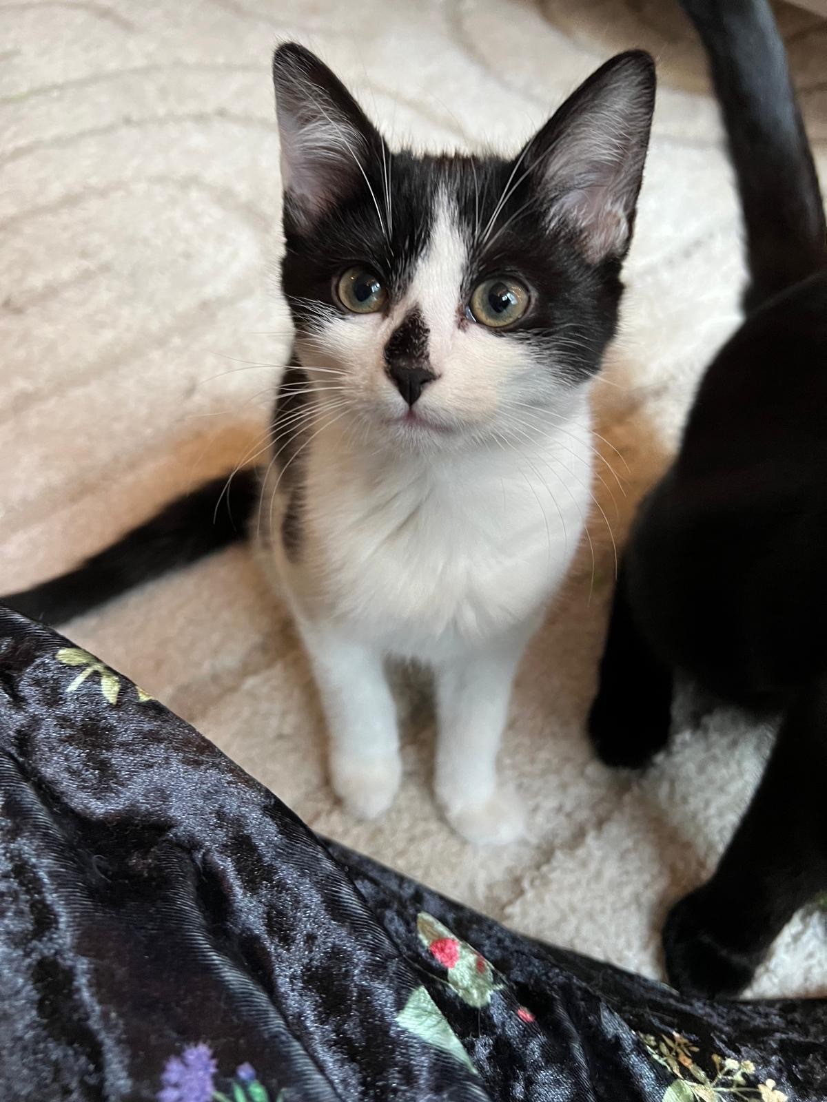 Caractère : Pandala est une adorable chatonne noire et blanche, particulièrement proche des humains. Elle apprécie leur présence et vient chercher des câlins, des caresses et des jeux. Pandala est gourmande, elle attend avec impatience sa pâtée et ne manque jamais une occasion de goûter ce qui lui passe sous la patte ! Tout ce qui se mange et est laissé à sa portée est en danger d’être gouté. Joueuse, elle adore courir après son jouet préféré, la canne à pêche, et ne saura pas s’arrêter de jouer avant vous. Pandala s’entend très bien avec le chat de sa famille d’accueil. Ils passent de longs moments à jouer ensemble ou à se reposer côte à côte.