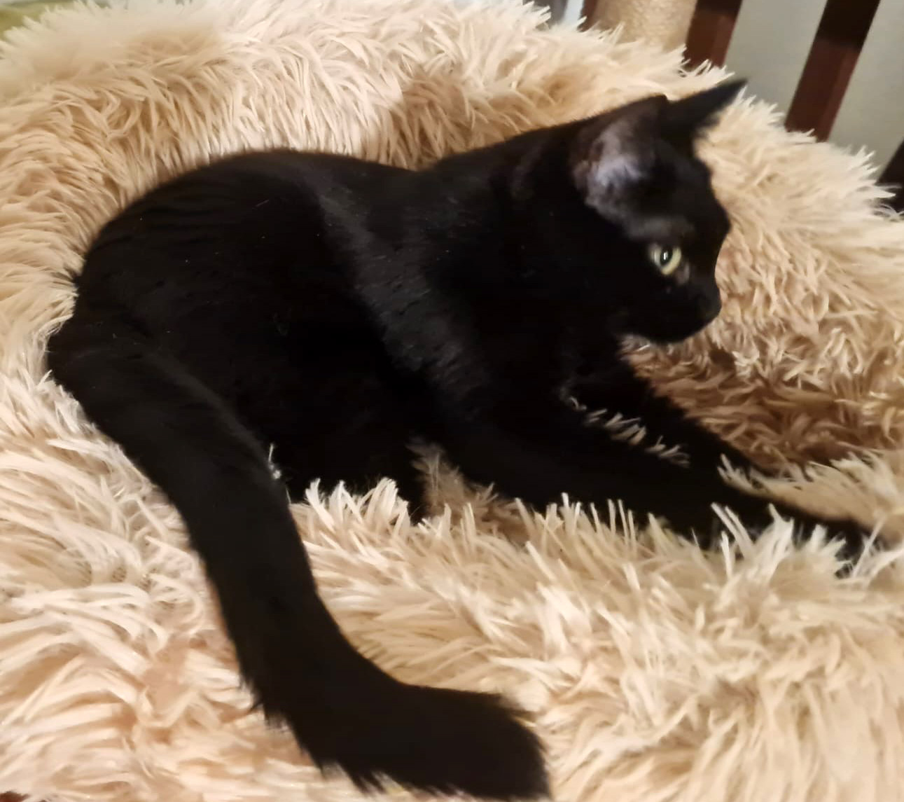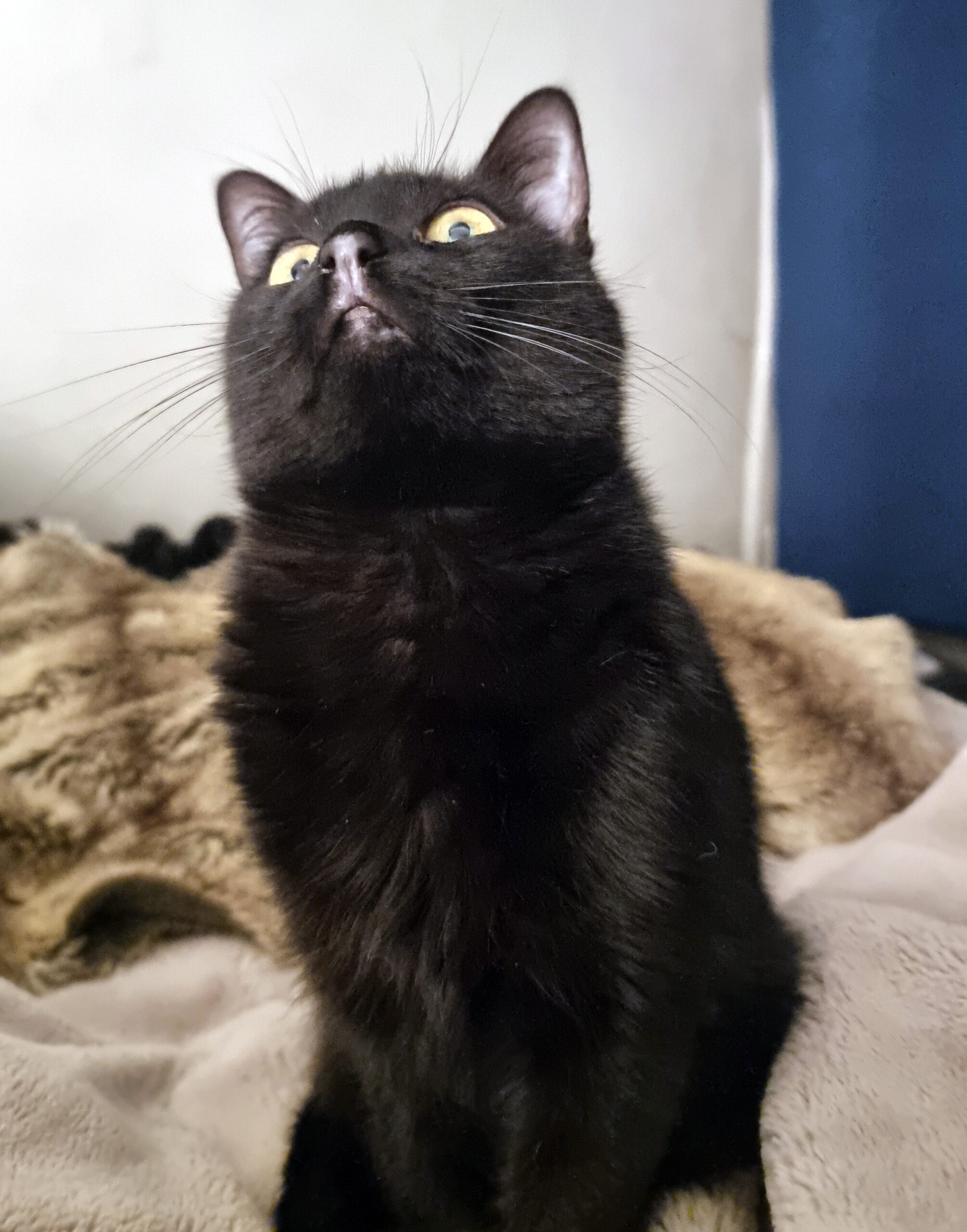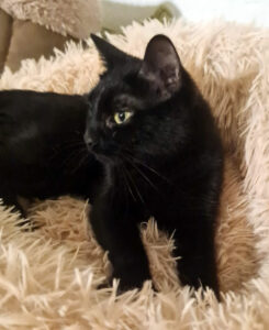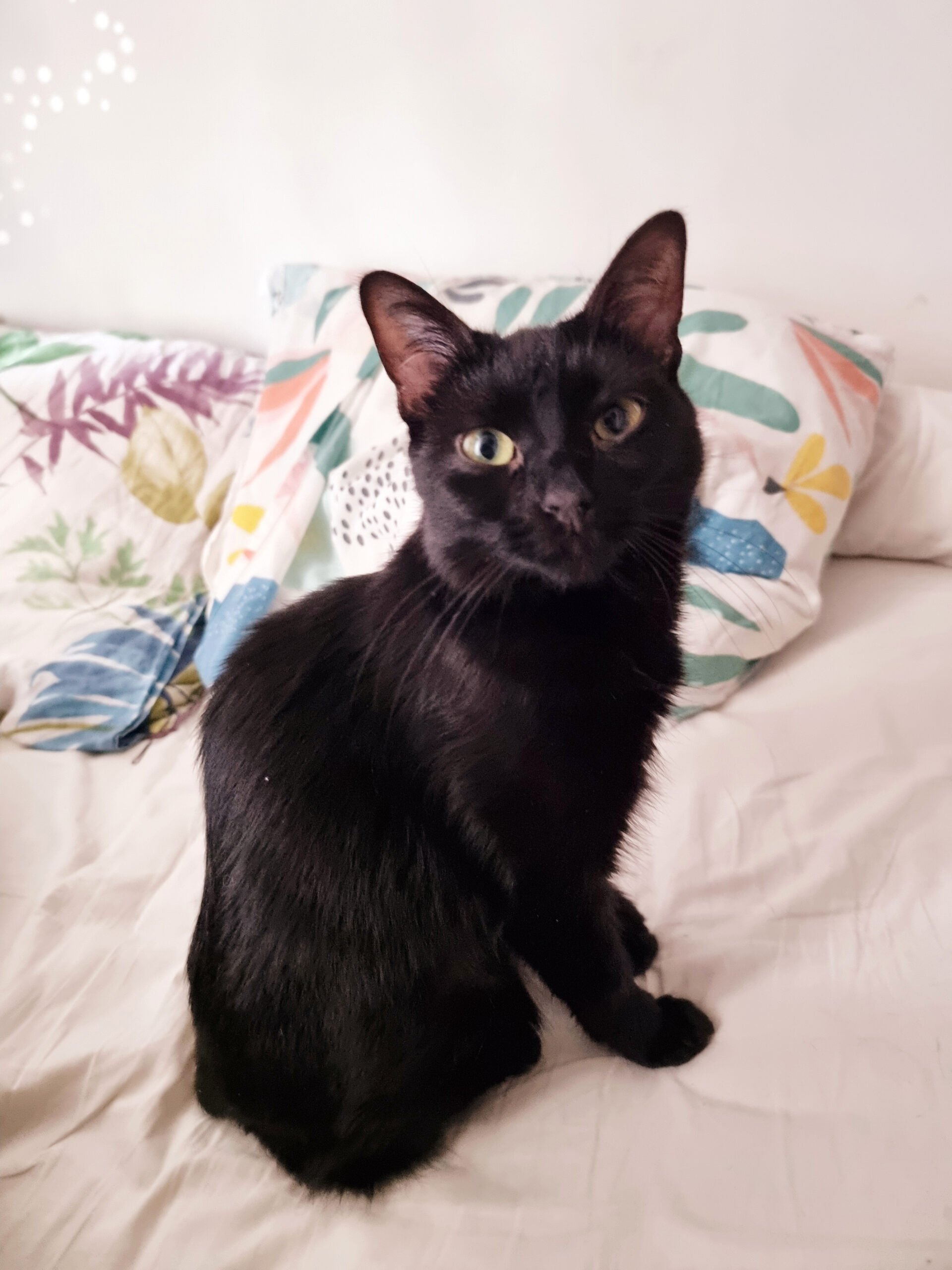 Caractéristiques physiques : petite minette noire aux grands yeux verts.