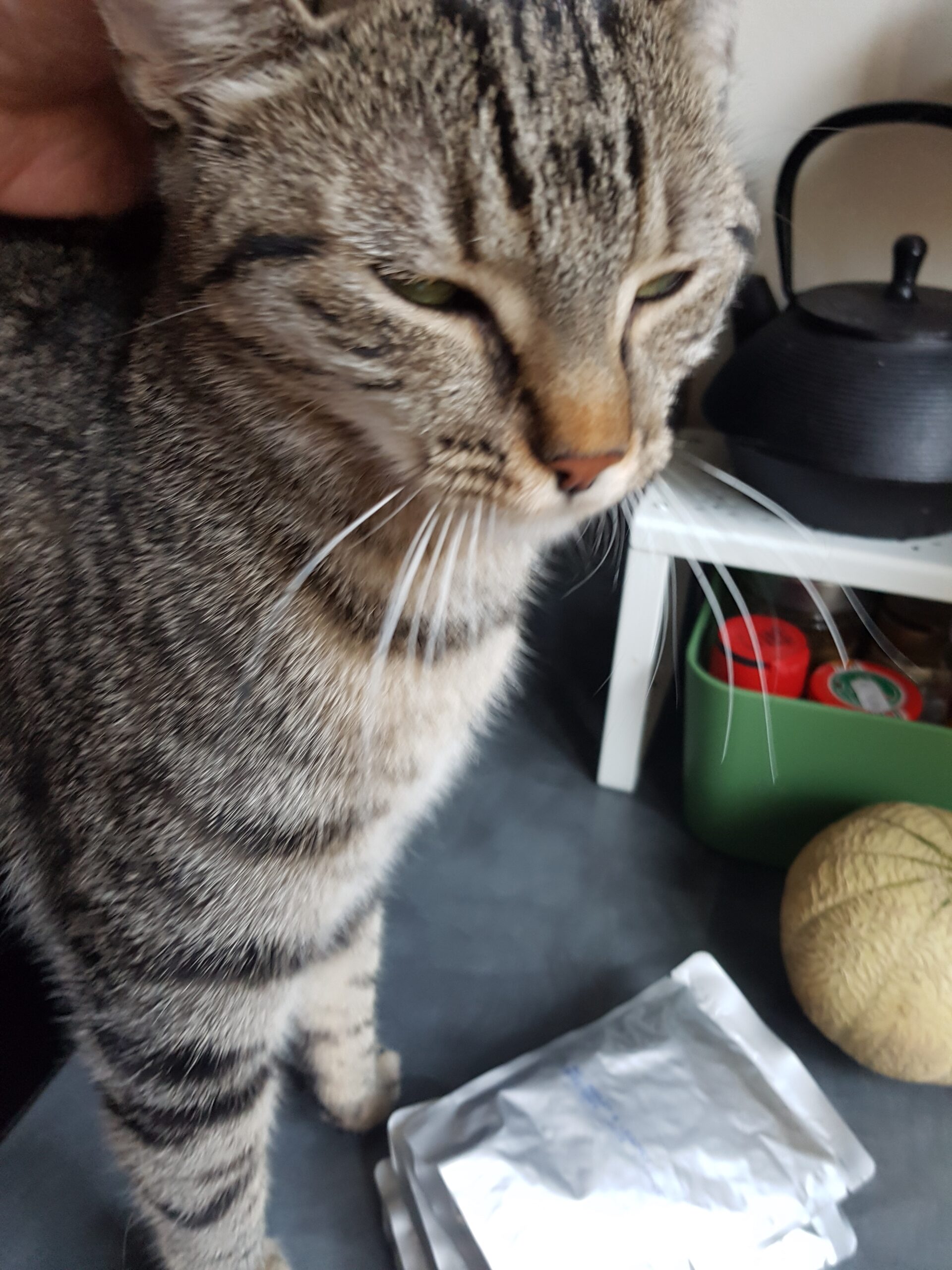 Gaïa a compris que l’endroit le plus sympathique était celui où « on décapsulait » la petite boîte de pâtée, clic !!! Point