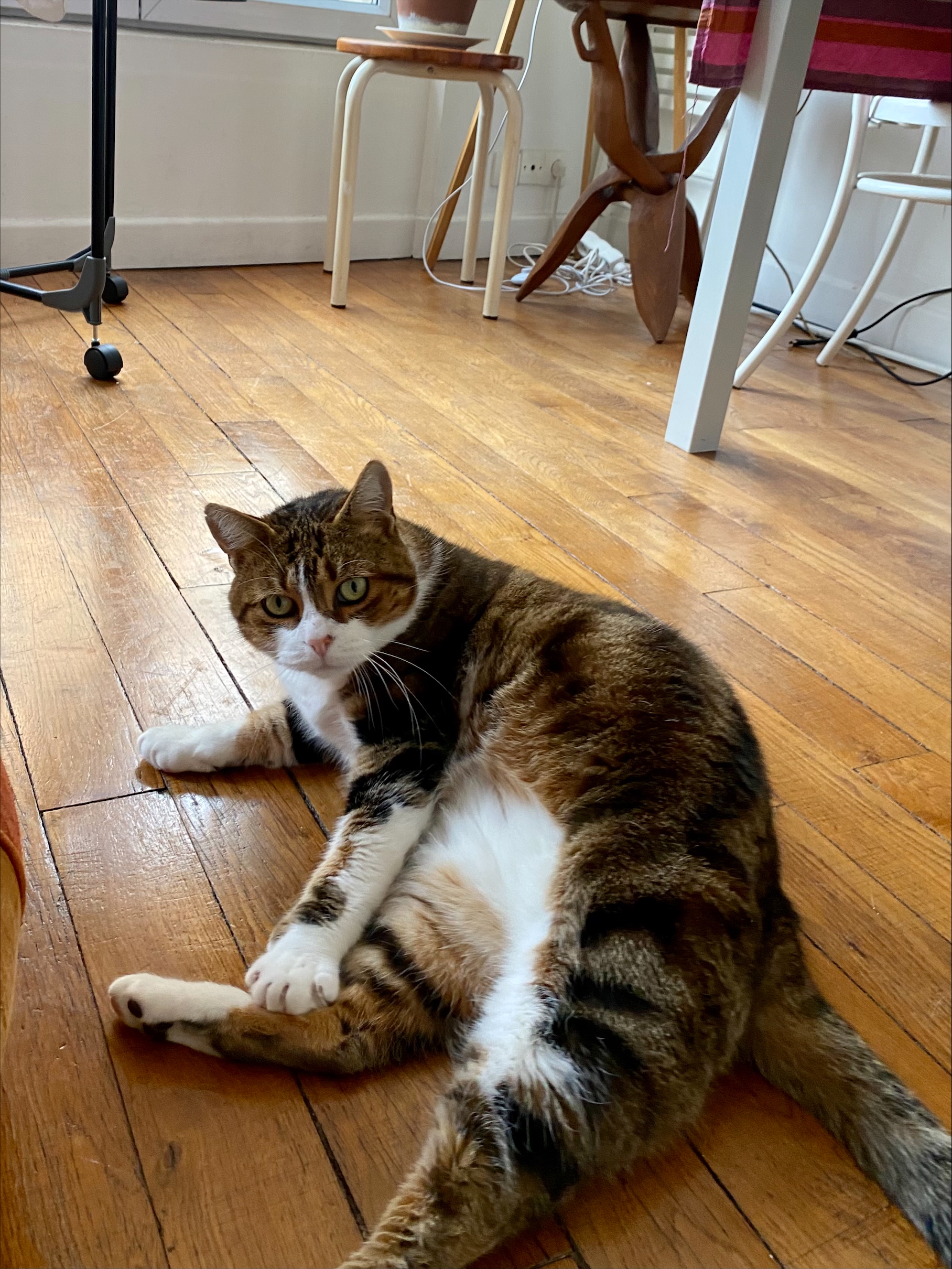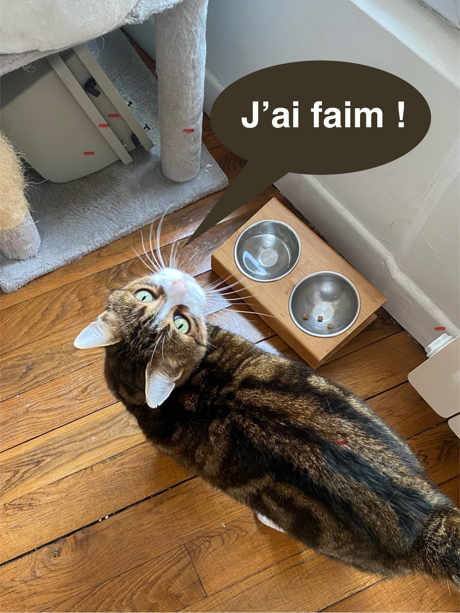 C’est aussi un petit gourmand ! Il n’hésite pas à miauler quand il a faim, mais il ne tente jamais de voler dans l’assiette quand vous mangez.