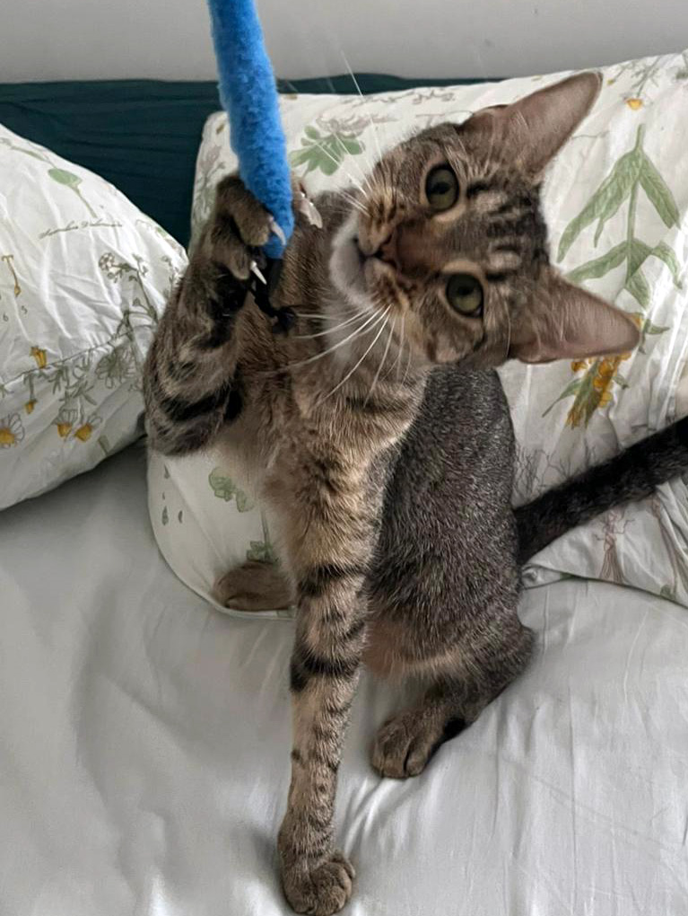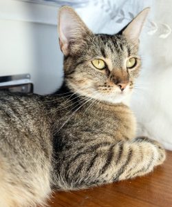 Caractère : Nala est une petite chatte adorable, sociable et pleine de vie. Qui accueille chaque nouvelle personne avec douceur et curiosité. Très joueuse, elle a beaucoup d’énergie : elle adore courir après un jouet, sauter partout et explorer le moindre recoin, toujours aux aguets avec ses grandes oreilles et ses beaux yeux verts. Il lui arrive de mordiller dans le jeu quand elle est excitée, sans aucune agressivité. Nala aime aussi suivre son humain partout et rester proche de lui, que ce soit sur le canapé, perchée sur un bureau ou installée près d’une fenêtre. Elle apprécie aussi les câlins dans ses moments de calme et ronronne volontiers. C’est une chatte expressive, qui miaule parfois pour attirer l’attention car elle est très gourmande et fascinée par tout ce qui se mange !