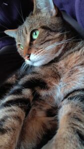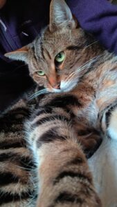 Il a ses habitudes alimentaires (une marque de pâtée exclusive), mais il est facile sur les croquettes et ce n’est pas un gros mangeur. Il évolue gentiment, il dort maintenant au pied de mon lit et vient régulièrement chercher des caresses. C’est un ronronneur, une fois qu’il a trouvé son moteur, il vous le fera souvent entendre. Ne pas rater le moment quand vous revenez après une absence : il vous accueille quand vous ouvrez la porte, parfois d’un miaulement de présence. Car il veut ronronner et partager un moment avec vous. 😊