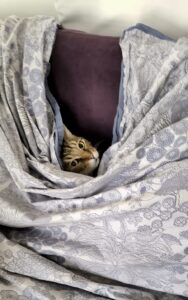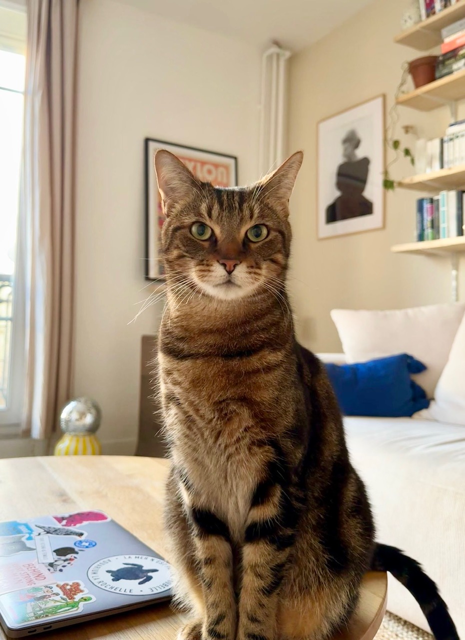Il sait rester seul la journée, aux horaires de bureau, comme rester en boule près du bureau et partager des journées de télétravail. Il adore les coins où se glisser sous un tissu / une couette.