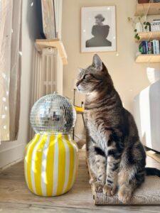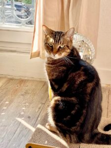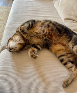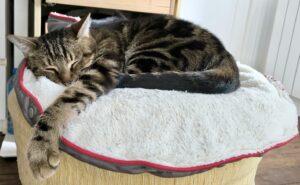 Il a deux-trois moments de jeux intenses avec ses souris par jour et préfère les caresses aux bras. Il aime bien se faire brosser et a une relation forte avec son griffoir en carton où il vient s’étirer, griffer, se coucher, se poster pour regarder dehors.