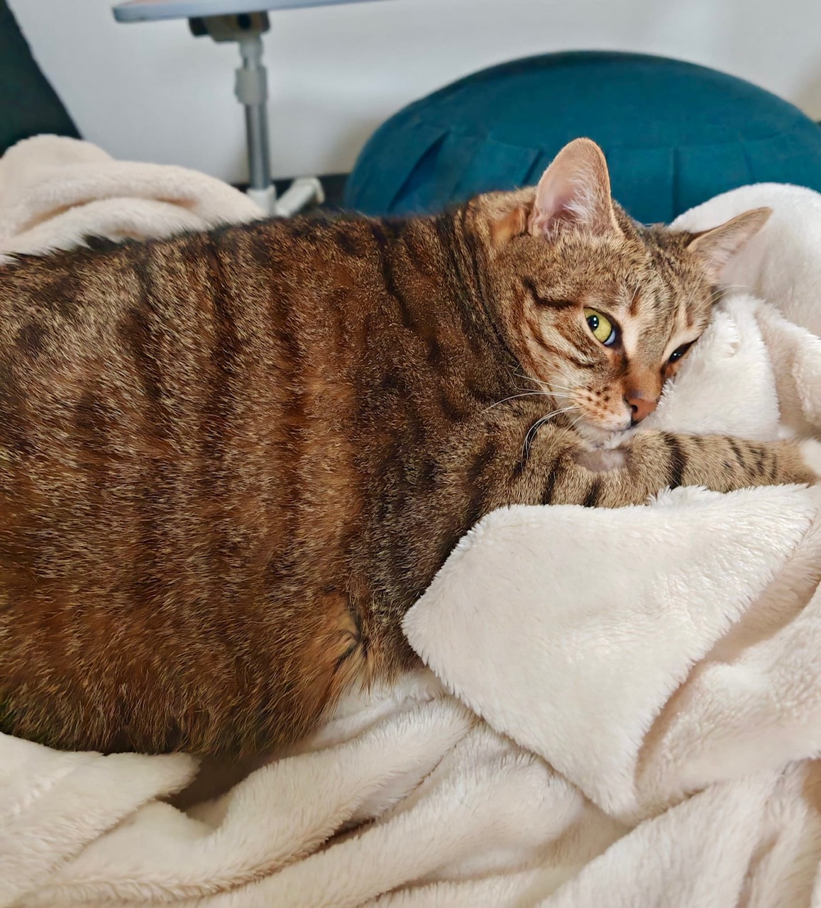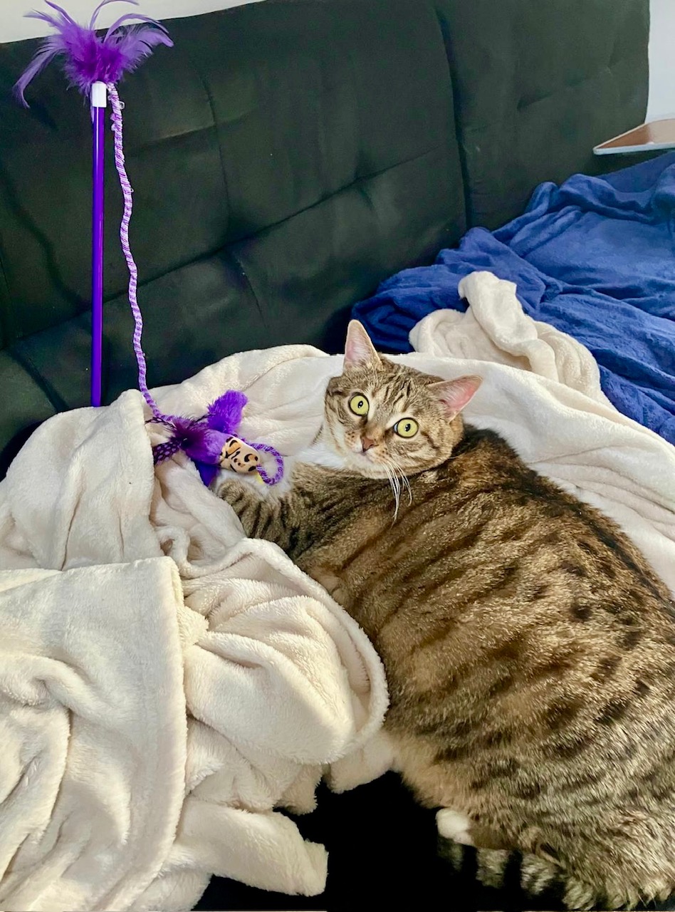 Stella est aussi joueuse, surtout depuis qu’elle a commencé à perdre du poids : elle adore qu’on la fasse jouer avec des bouts de ficelles (ou tout autre objet qui bouge). Elle aime aussi son arbre griffoir pour s’étirer après une sieste en se faisant les griffes.