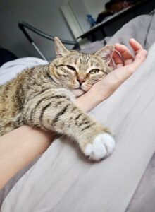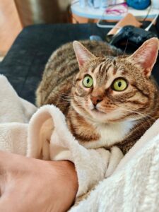 C’est un vrai pot de colle qui adore se frotter contre nous en ronronnant. Dès que l’on s’assoit sur le canapé, on peut être sûr qu’elle va venir sur nos genoux réclamer des câlins ! Très facile à vivre, c’est une chatte vraiment gentille, qui a beaucoup d’amour à donner… Et à recevoir.