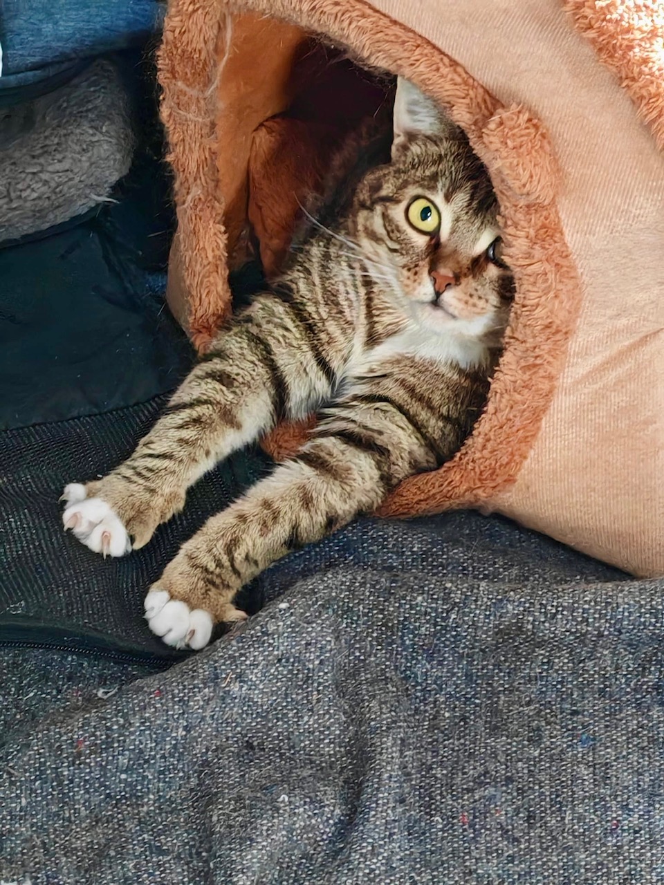 Son spot préféré : un plaid moelleux idéalement placé tout près de vous pour que sa patte soit toujours au contact. Sinon sa niche est sa forteresse de solitude pour un sommeil tranquille.