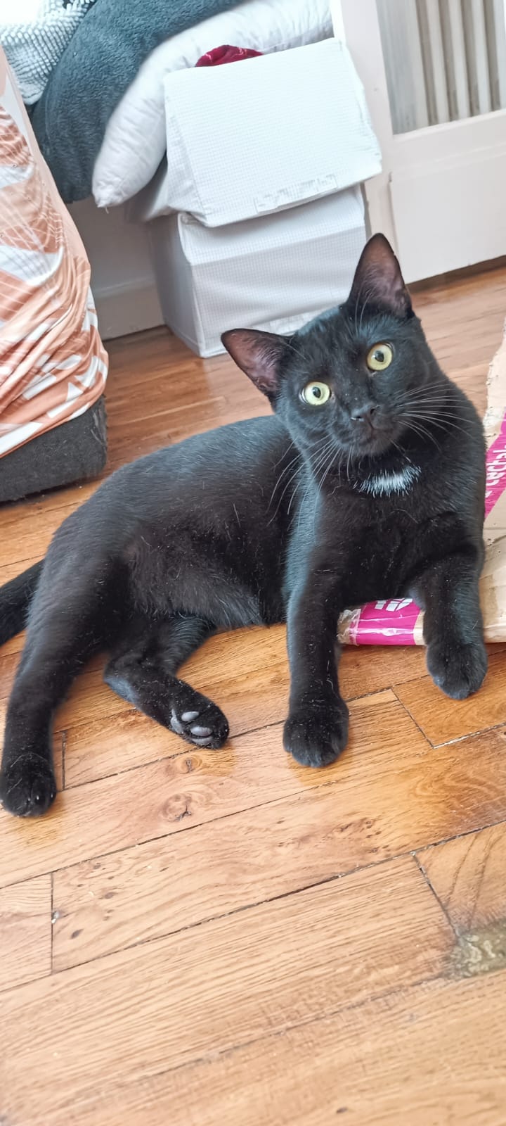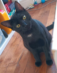 Caractéristiques physiques : Beau chat noir avec une petite tache blanche sous le cou.