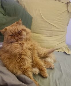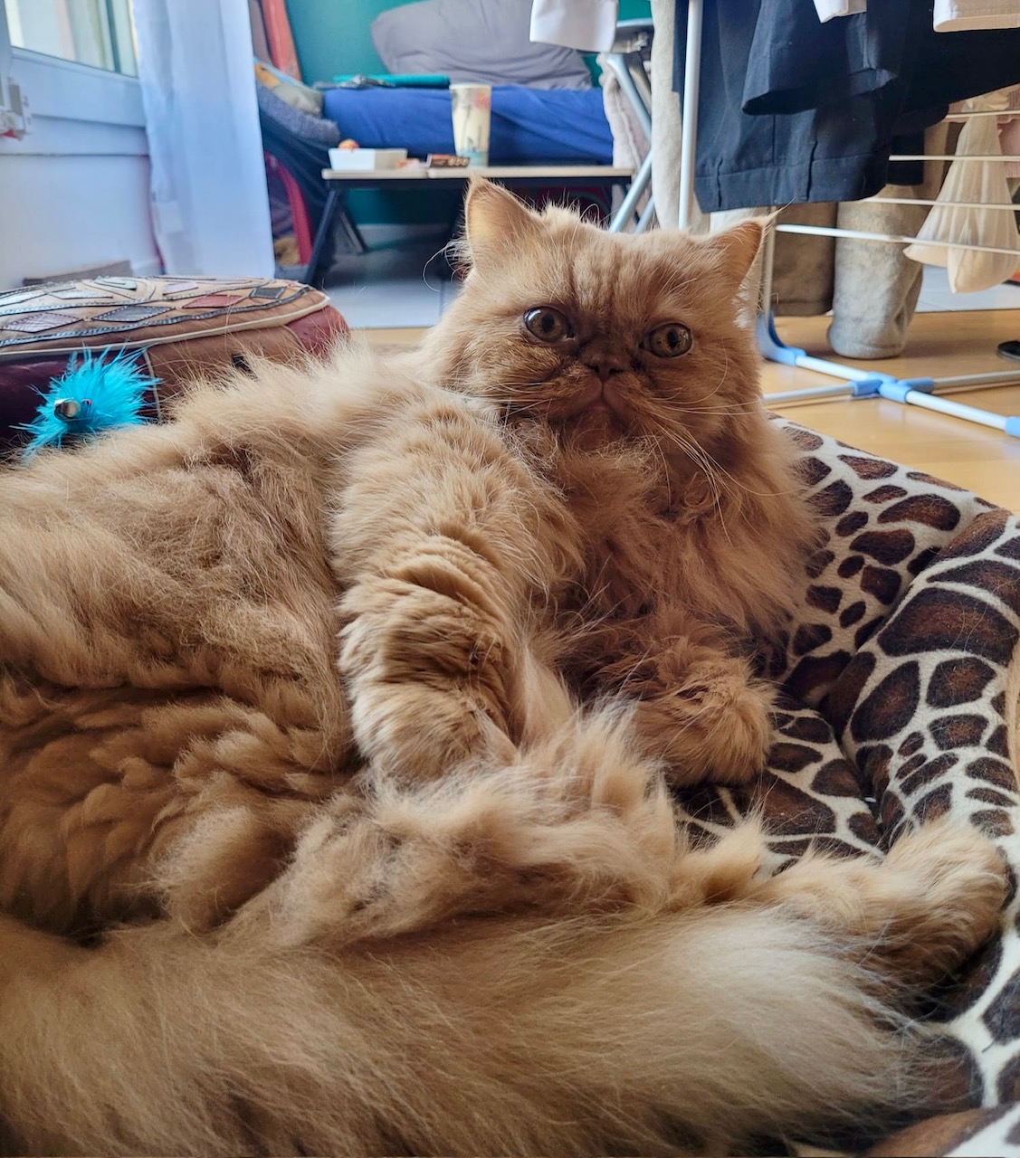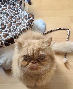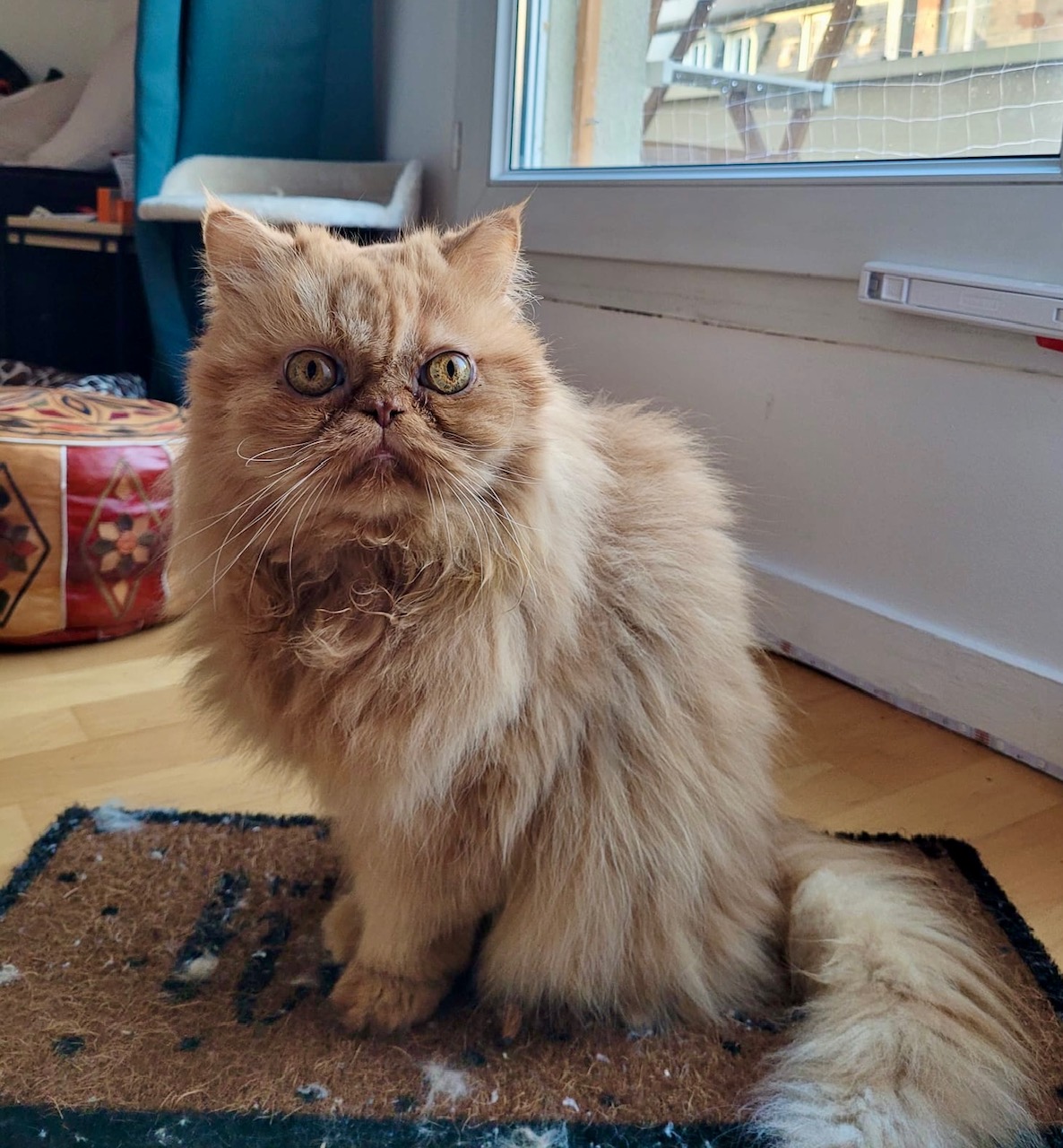 Caractère : Caramel est un petit papi chat persan qui adore les moments de câlins et vous en réclamera à longueur de journée ! De nature très curieux, il vous suivra dans toutes vos activités en intérieur et viendra renifler tout ce que vous pouvez mettre entre vos mains. Il aimera se poser à la fenêtre pour sentir l’air frais, mais ne sortira jamais une patte au froid, monsieur est un peu précieux ! Caramel est un chat très doux et calme qui va adorer se poser sur votre poitrine ou dormir à vos pieds (en revanche il n’apprécie pas être porté). C’est un chat très gourmand qui n’hésitera pas à vous faire savoir quand il voudra la pâtée ! Il est bavard pour la pâtée et les caresses ! Malgré son calme, il aura tous les jours des petites envies de jeux, notamment avec une canne ou un fil, mais ne sortira jamais les griffes et ne mordra pas non plus. Un peu timide, il lui faudra du temps pour se dévoiler, et aura juste besoin d’être rassuré.