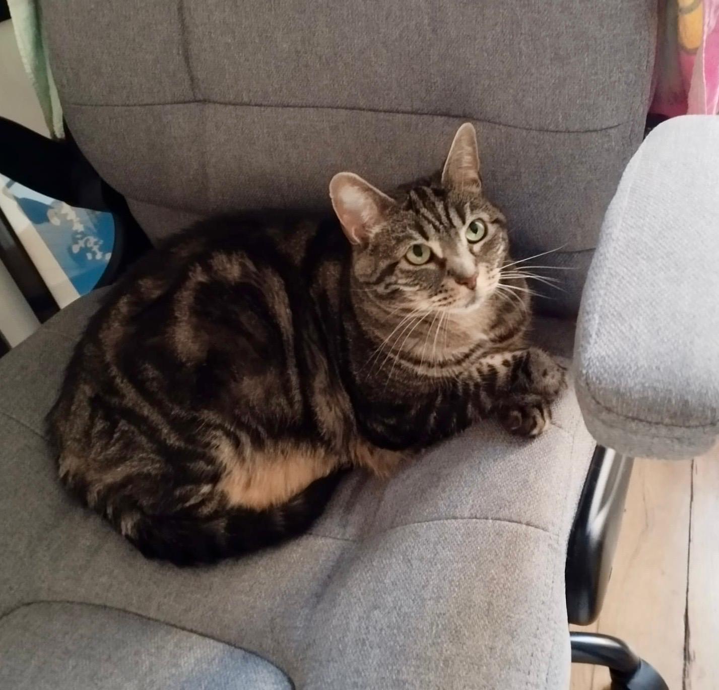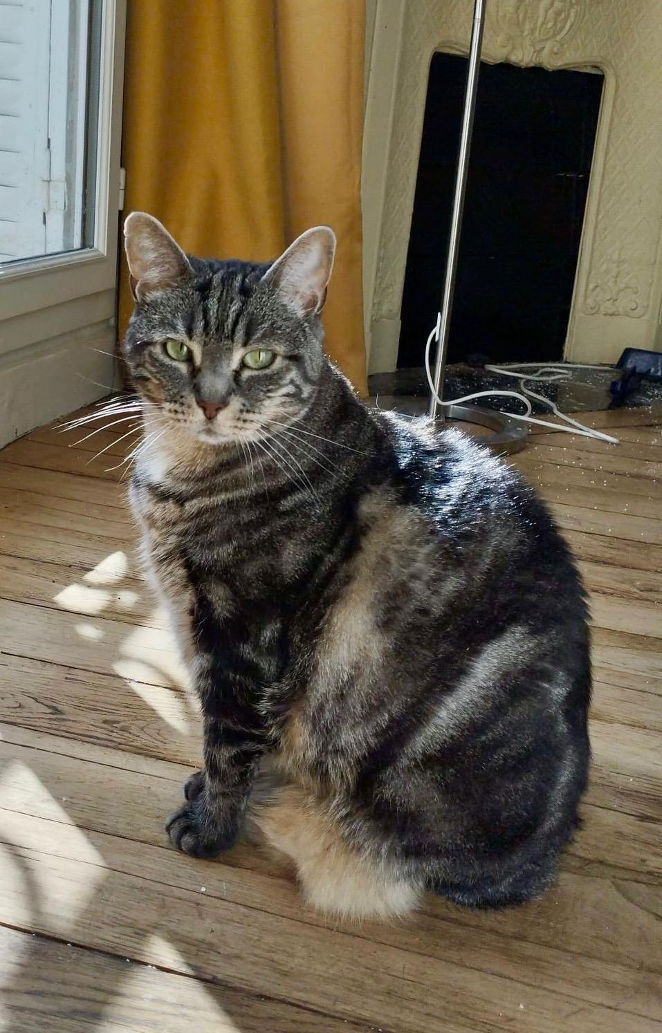 Caractéristiques physiques : magnifique chatte tigrée grise, un peu dodue.