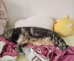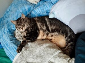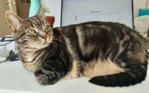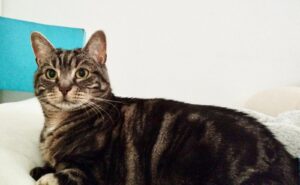 Pour son âge, elle est tout de même assez active. Elle ne court pas partout, mais on trouve qu’elle a l’attitude d’un chat de plutôt 5/6 ans qu’un chat senior de 10 ans. Elle est souvent réveillée et sait être encore dynamique, dans le jeu notamment.