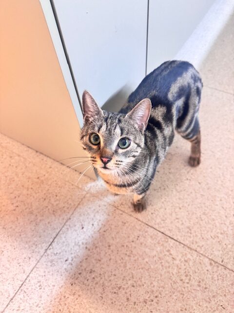 Caractéristiques physiques : chatte tigrée tabby brown. Testée négatif Fiv/FeLV, elle est vaccinée et stérisée par l’association.