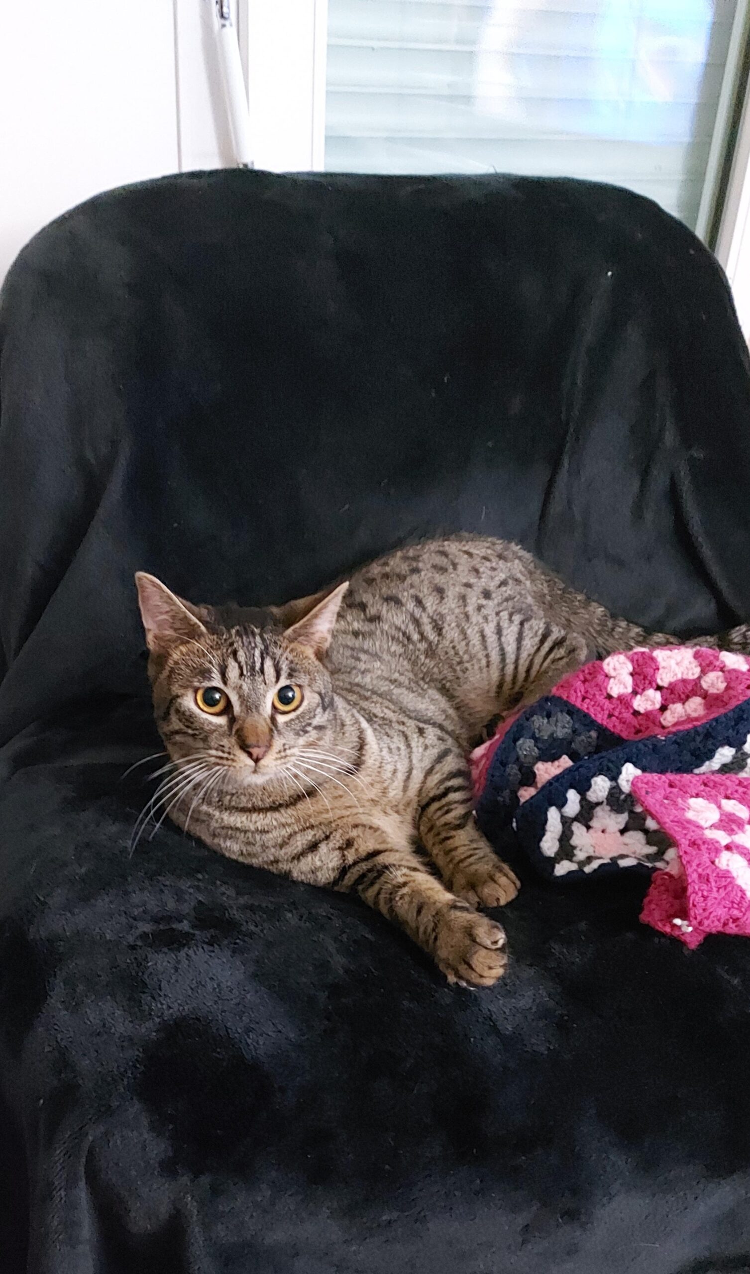 Caractéristiques physiques : joli pelage tigré tacheté avec des yeux orange.