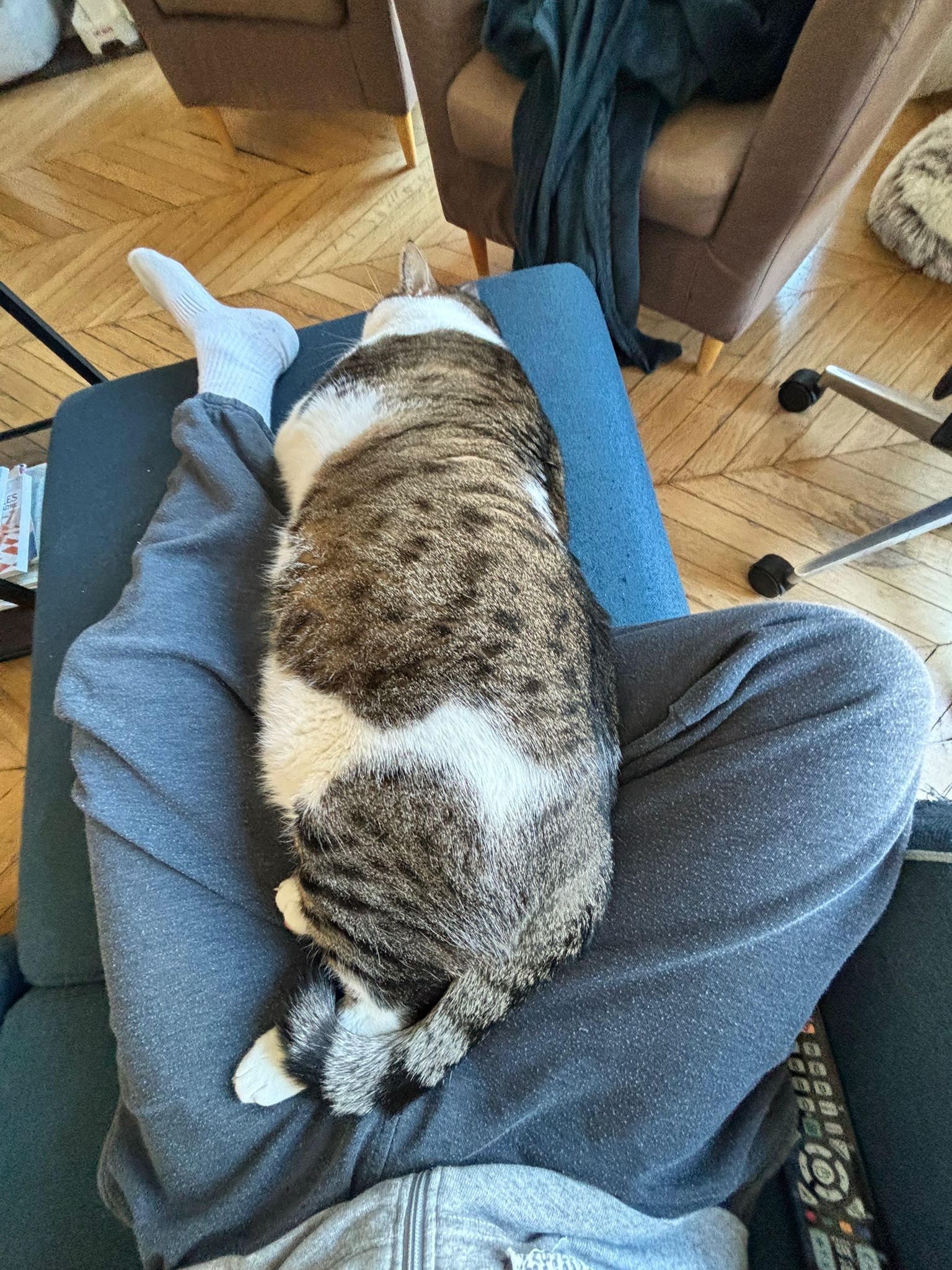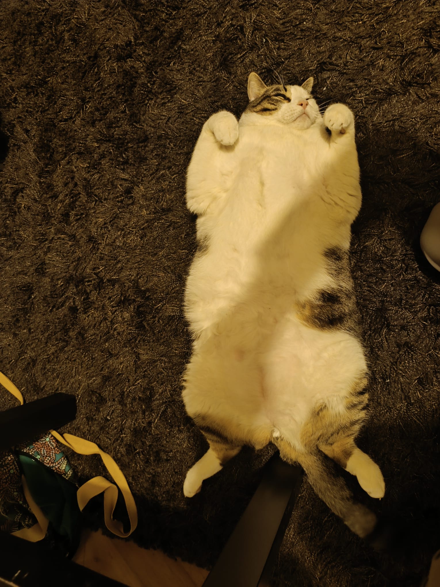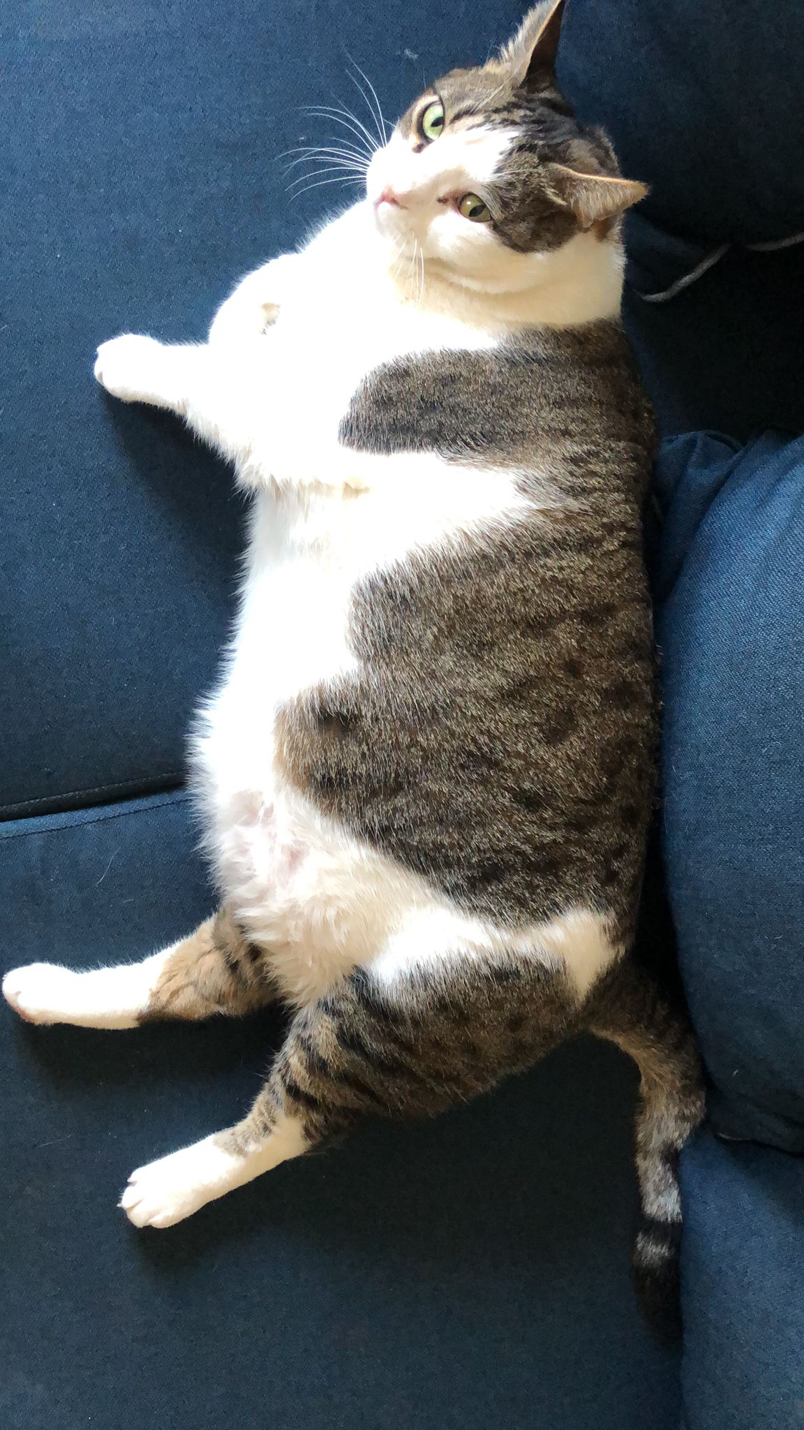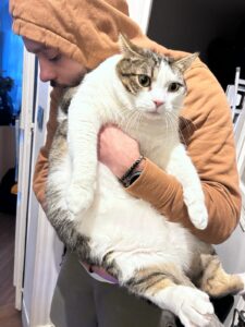Très gourmand, il sait aussi se faire comprendre : il lui arrive de miauler en faisant une petite parade nuptiale pleine de charme pour réclamer ses croquettes ! Très rondouillet (conséquence de la négligence de son ancienne famille) et doté d’un talent surprenant pour repérer les paquets de chips, surtout les Curly lors des apéritifs, il suit aujourd’hui un régime avec des croquettes adaptées, qu’il gère très bien.